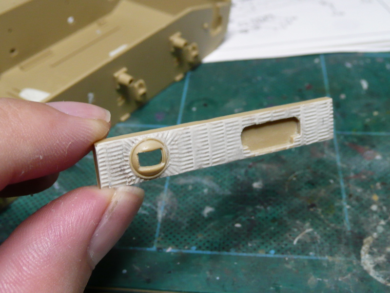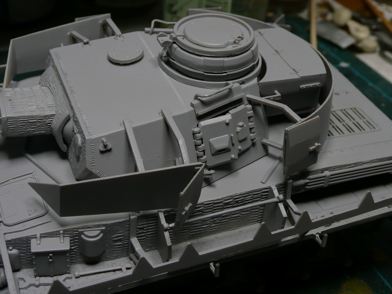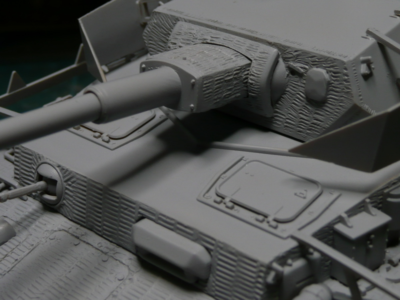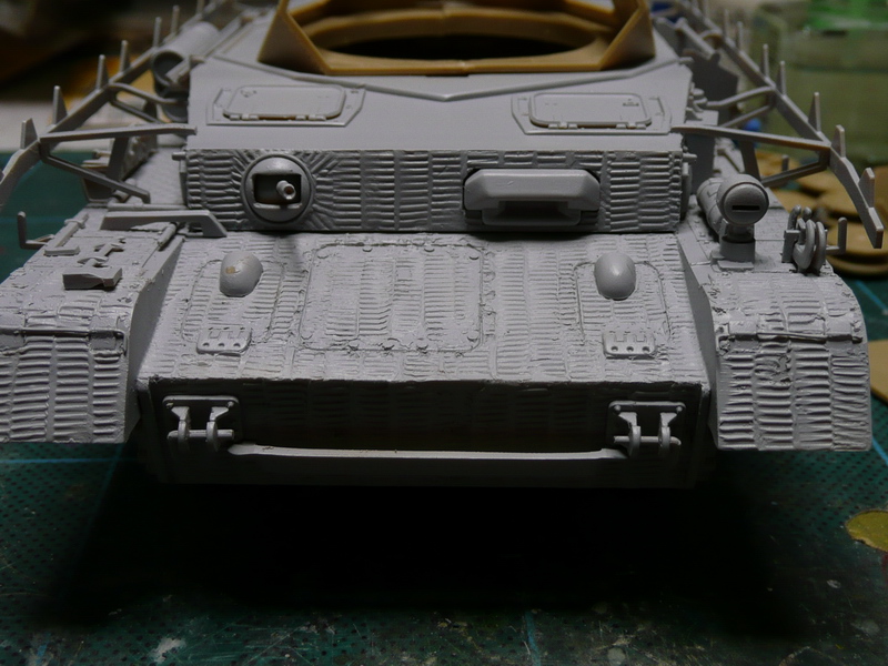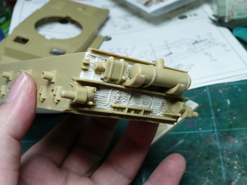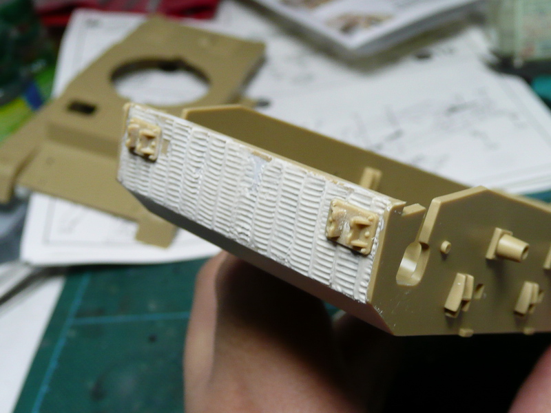 Construction begins by adding zimmerit to the hull and priming with Mr. Surfacer. Zimmerit was applied using AFV’s zimmerit applicator and the zimmerit paste is from 2 part bondite epoxy putty. This is followed by partial assembly of the turret. The fit of the hull is not good at all. There is a big gap at the rear that will take a good amount of filler to close. Also, this kit was made to be motorized. Hence, a couple of holes in the side of the hull for battery place holders. These will have to be filled too.