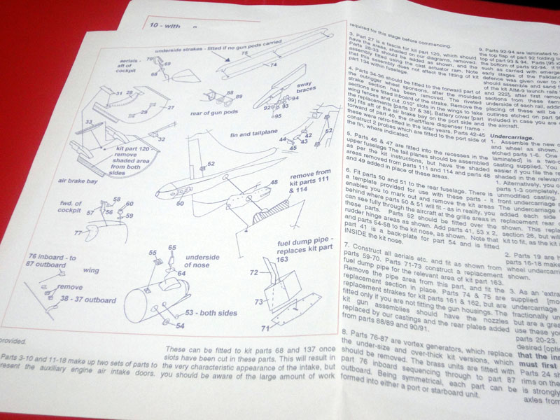 Flightpath's superdetailing set consists of PE frets, white metal casting, resin parts, film, printed sheets and a bit of string. The PE is divided into one fret for the cockpit including the seat (yes, the whole seat is PE with white metal),one for the exterior enhancements, one for weapons, one for the Sidewinder replacements (together with resin body), one for the airfield accessories, and ladder. The white metal casting consists of air intake covers, seats, control sticks, seat parts, front undercarriage and Aden gun enhancement muzzle and back while the rope and printed materials are essentially airfield diorama enhancement parts. Resin parts are provided for the wheels, sidewinder and cluster bomb body. The instruction sheets takes at least 3 to 4 readingd and forward planning is absolutely essential. The PE parts seems a bit thick and are a real curse to cut but they do bend quite well after annealling. Be sure you do a lot of dry fitting as some modifications will be neccessary for the cockpit, Aden guns, air intakes, undercarriage, air brakes and rear jet details. On second thoughts, dry fit all the parts. They take a bit of effort but will be worth the time once completed.