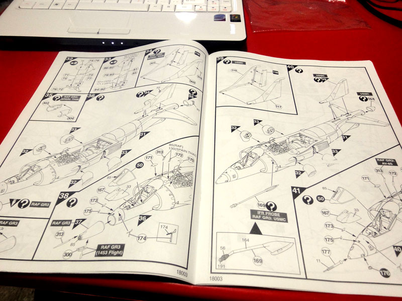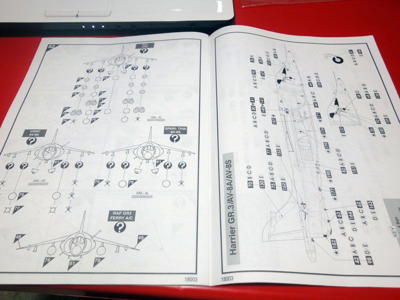 Construction breakdown is rather tricky due to the ill fitting parts especially on the air intakes and fuselage halves. There is a lot of cleanup required. The most obvious and troublesome flaw in the kit the the hundreds on rivet/fasteners on the fuselage. The GR3 has most of the fuselage in a smooth finish except for some panels in reality. A lot of putty and sanding work will be required. The clear parts are a bit thick and will require some cleaning and polishing. The decals are impressive in size but not in quality as they are badly out of register, especially for the stencil markings involving colours over a white undercoat. That said, 5 different markings are provided, a NATO Harrier ( based in Germany ), a Falkland campaign warbird, an American AV8A, a Spanish and a Thai Airforce plane. All good choices, showing the different paint schemes.