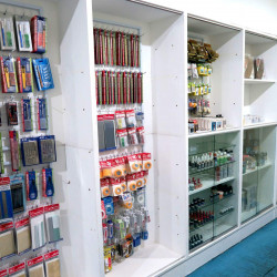 Racks of paints and finishing materials of most popular brands