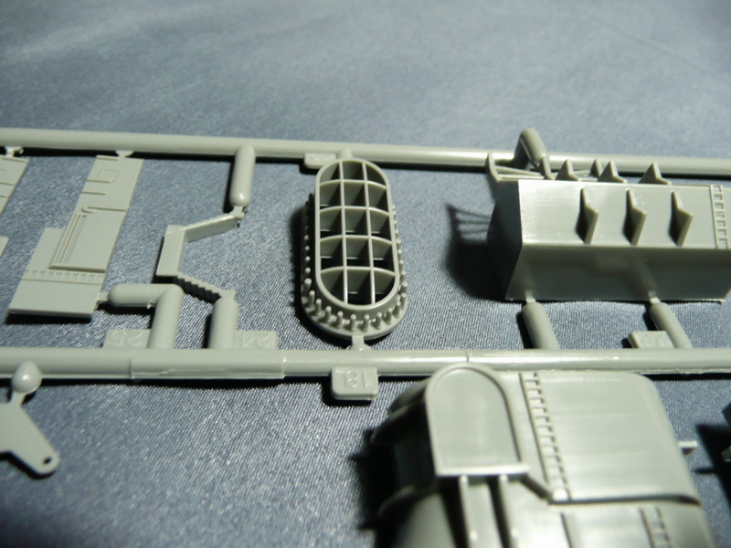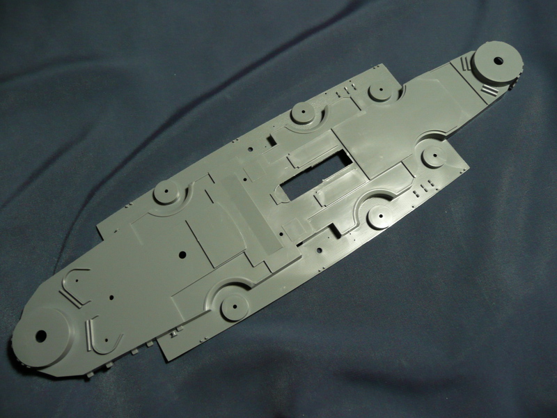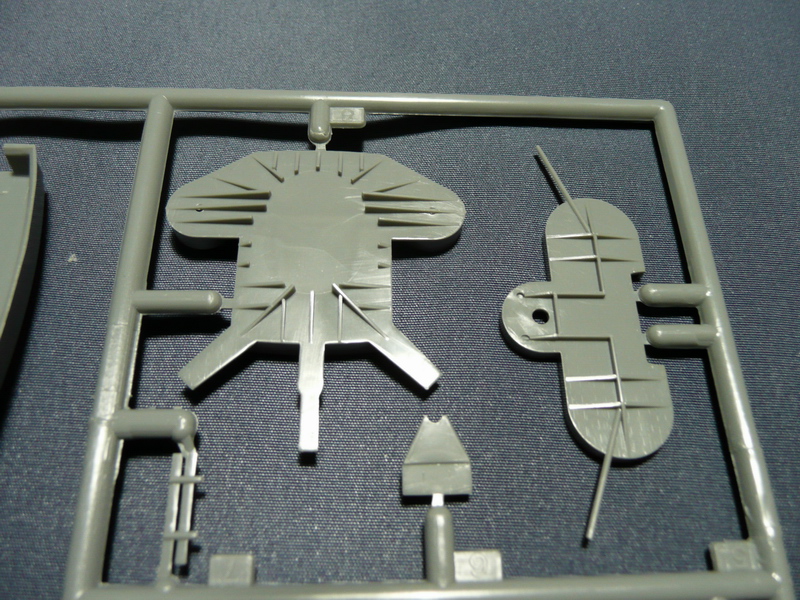 The kit is advertised as being 717mm in length and with a beam of 103mm and has the option to be motorised (evidenced by the moulded in battery holders). Provided in box are 1 complete single piece lower hull, 8 gray sprues of grey plastic and 1 black sprue.