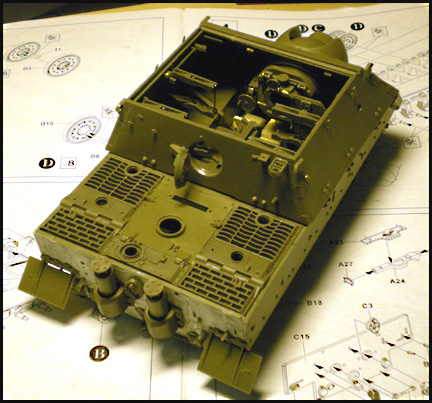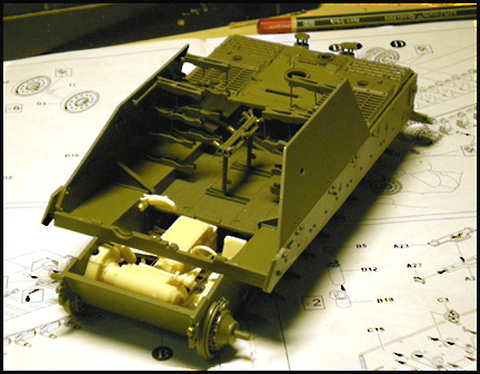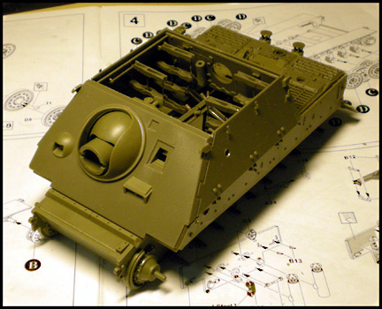 Upper rear view. The boxy top hull (from the original kit) is dry-fitted onto the interior wall plates. Notice the highly detailed mortar breech (also from the original kit). Fit is generally good.