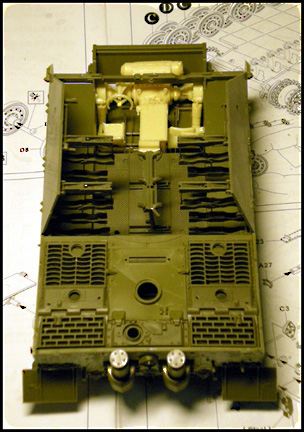 Driver’s compartment is assembled/unpainted but not yet glued to hull floor. You can see the loading tray (in the middle) and storage racks attached to the inner hull wall plates. All these items can be found only in the Interior set. (notice the gap where the firewall is supposed to be)