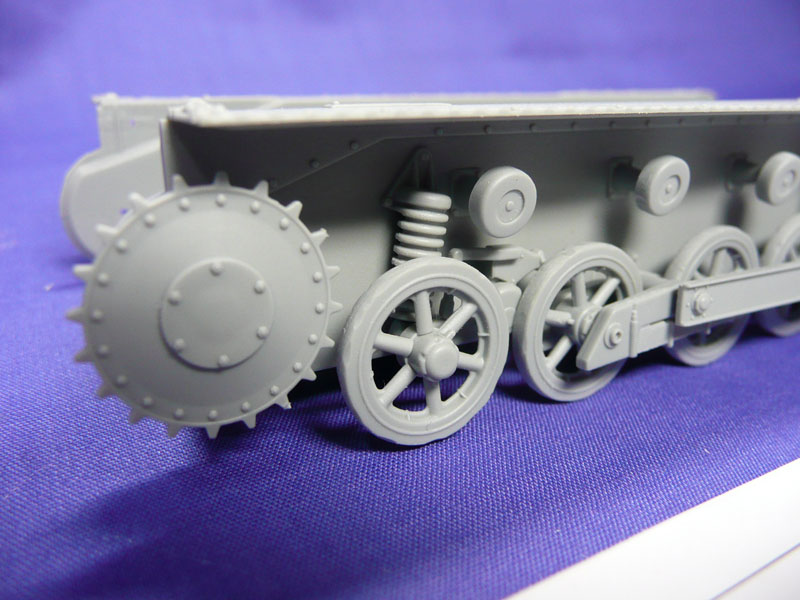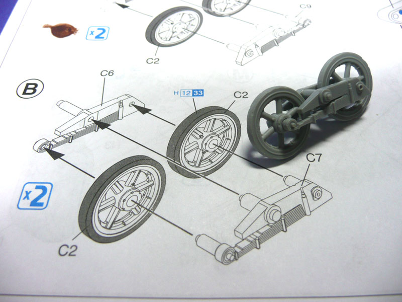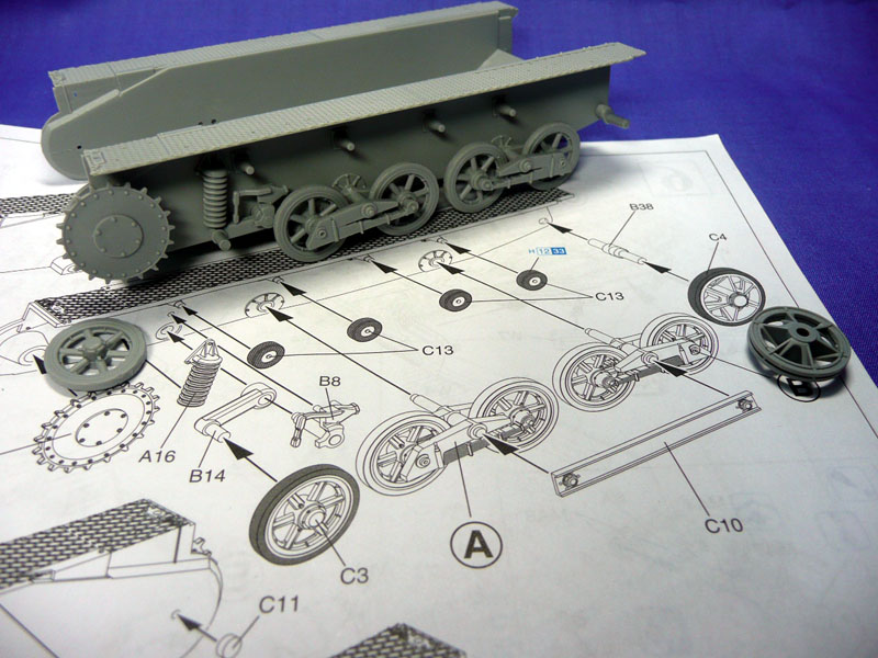 Step 3 and 4: Note that part C4 is now a combination of Part C4 and C14 if you have bought a later release. Except for the top rollers and part C10 connecting the wheel arms, I left all the parts unglued at this stage to ease painting later. Cleanup of part A16 is required to have a clean spring. Wheel C3 is again stresssed. I skipped Step 5 which detailed the track construction as I prefer to leave this before the hull parts are attached. Do align the top rollers as they do not fit snugly in to the arms. You may also opt to leave out parts C12 as the wheels will not be movable after the bar C10 is fixed.
