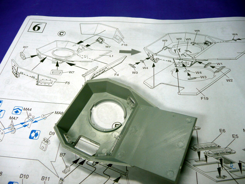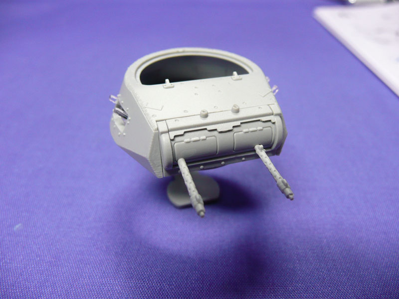 Step 10: After skipping Step 9, as I prefer to get all the subassemblies done first, the turret was next. The gun cradle cannot be made to move so you can glue them all in place. Do align the barrels true, level and parallel. I will need to drill the barrels out later for extra details as this kit does not use slide mould technology. The pistol ports are left undone to ease painting.