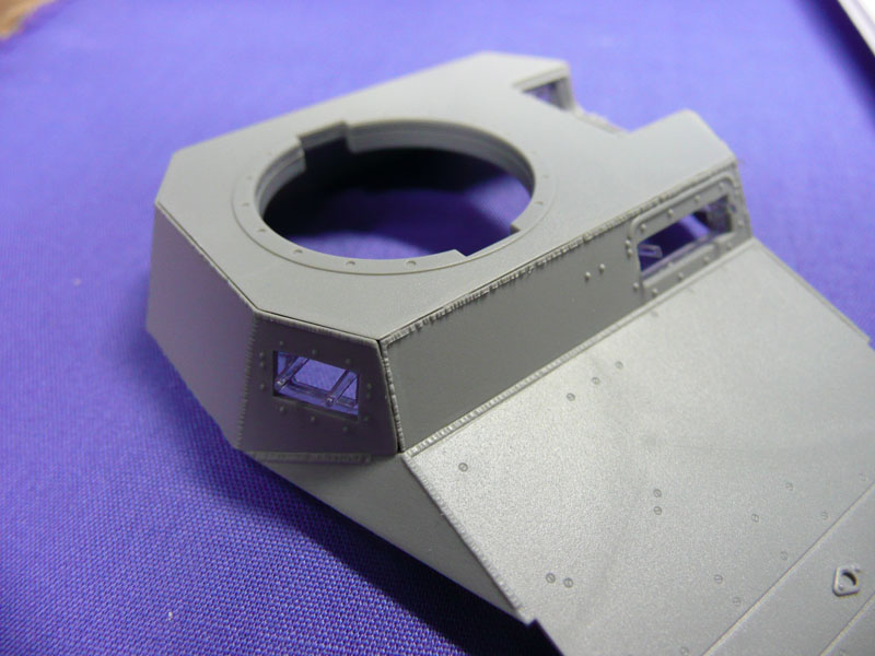 Step 6:The main hull construction is unconventional with the hull plates glued onto a base shape. Despite some sanding and hoaxing, I did not manage to get all the weld join areas to match. This however is easy to fix witha bit of dilluted putty at a later stage. I also left the vision port covers unattached to ease the painting process so that the clear blocks are not sprayed over.