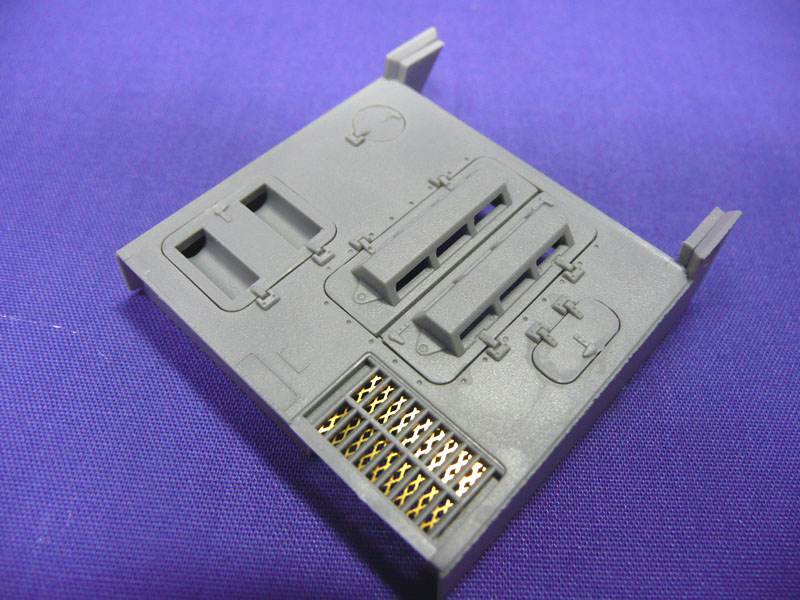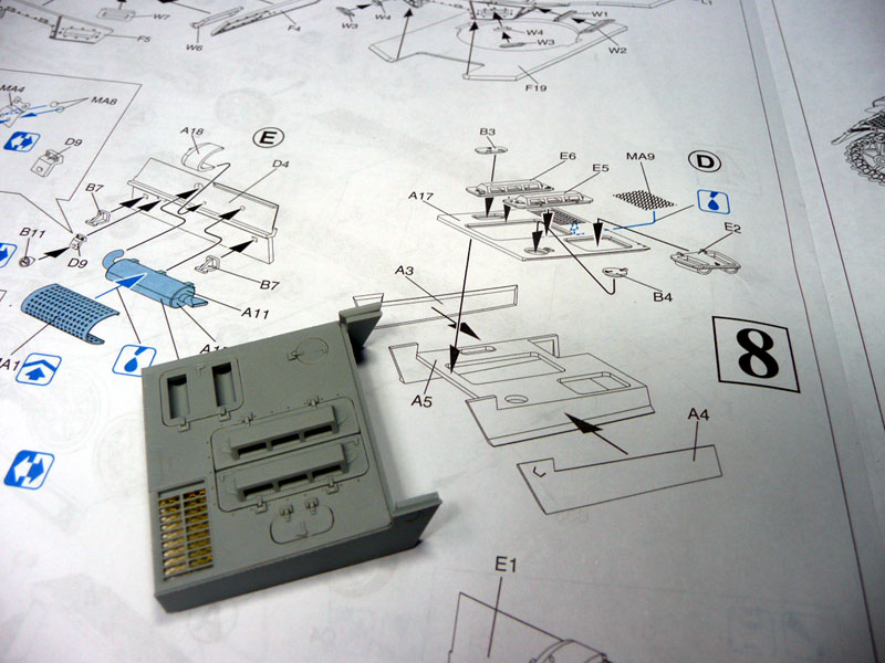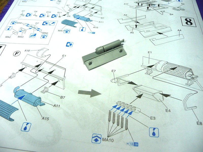 Step 8: Straighforward engine cover parts except a bit of trimming is required for the grille (MA9) as it will not fit. A bit of care is also needed to fit the covers ( part E5 and 6) so that the spacing is even. Some light sanding may be required.
