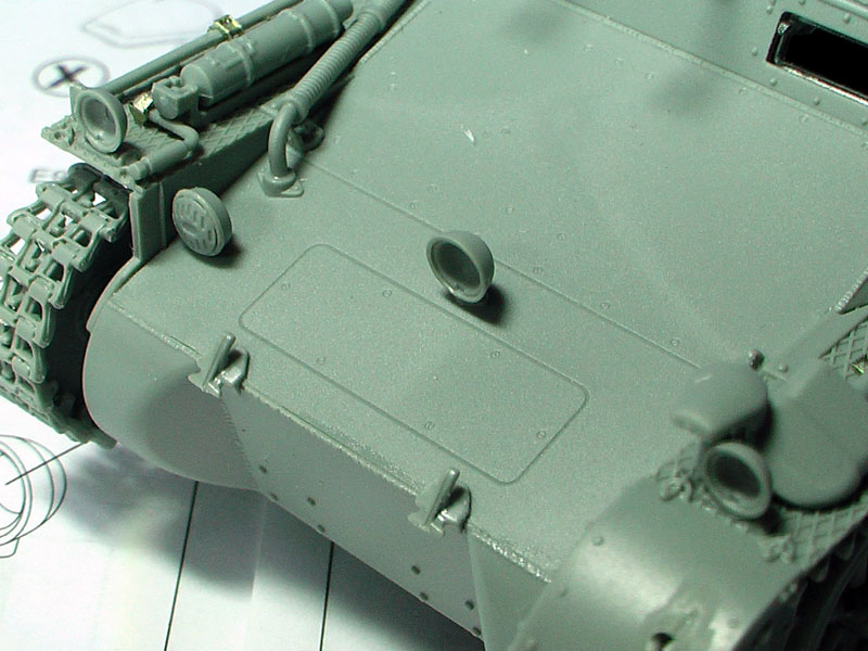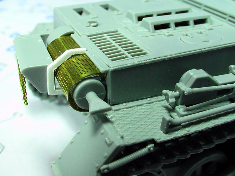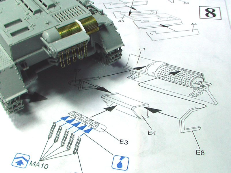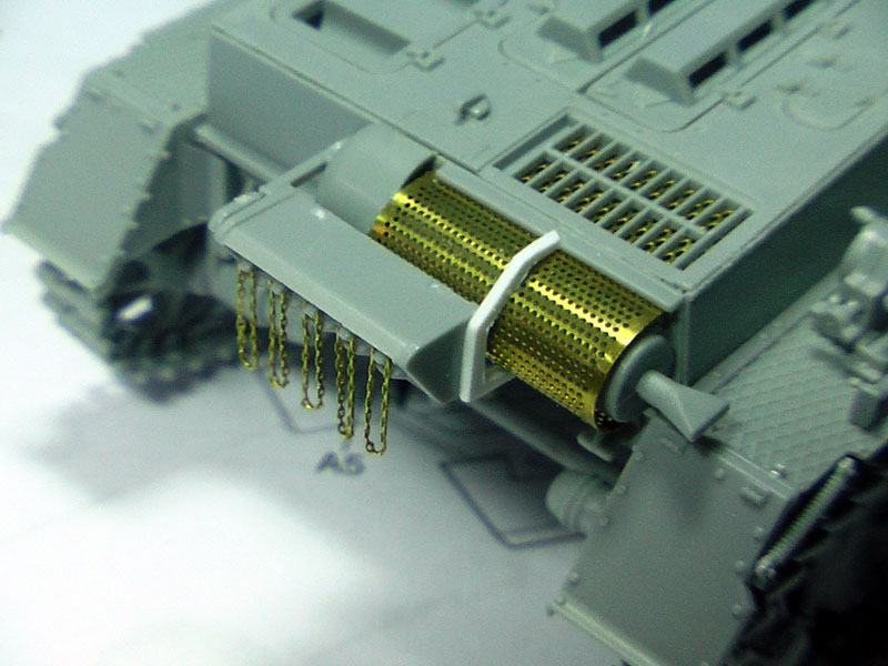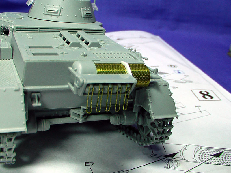 Step 7: Rear Hull and exhaust: As the option with the smoke candles were chosen, a bit or work on the PE is required. A bit of care is required for the exhaust grille and as I could not get any reference pics for a proper fit, the bolt connecting tabs required some guestimate. Part E8 needs to be extended to fit over the grille. Instead, I reworked the part with a thin plastic card.