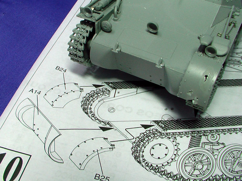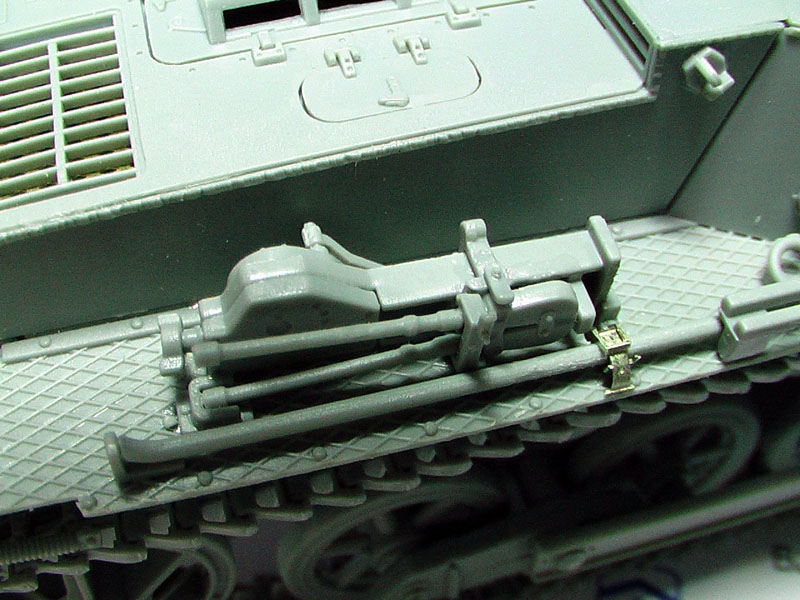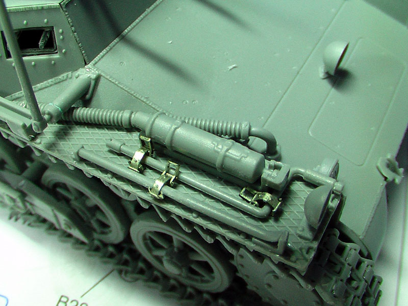 Step 13: Hull attachement: The wooden stowage box strap ( Part B39) was upgraded with a bit of brass scrap. The only other major problem needing some thought is that the 6 cans grille work is too long to fit the fenders at the rear and some form of holding strip has to be improvised later. The fire extinguisher and turning bar is opt located at the front fenders.
