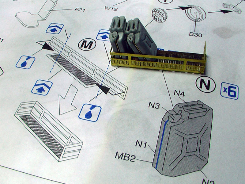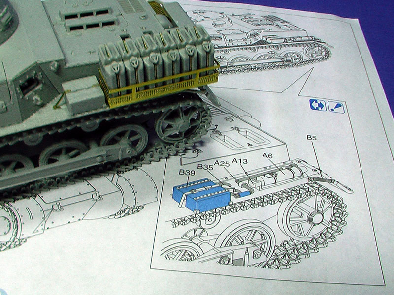 Step 9: Lamps, lights, stowage and horns. This step was quite straighforward except for the PE grille to hold the jerry cans, including the cans. A bit of filing for the can tabs is required to let the part MB2 fit well in between 2 halves. There also appear to be no reference or tab to fit the neck of the can so some reference pictures are required. You will also need to trim the locator pins of the jack holders which are attached to the chequered side platforms. Without trimming, the holders will not sit well. Its a strange thing that Dragon did not include the tow cables which is so much of a character for the Pz1s.