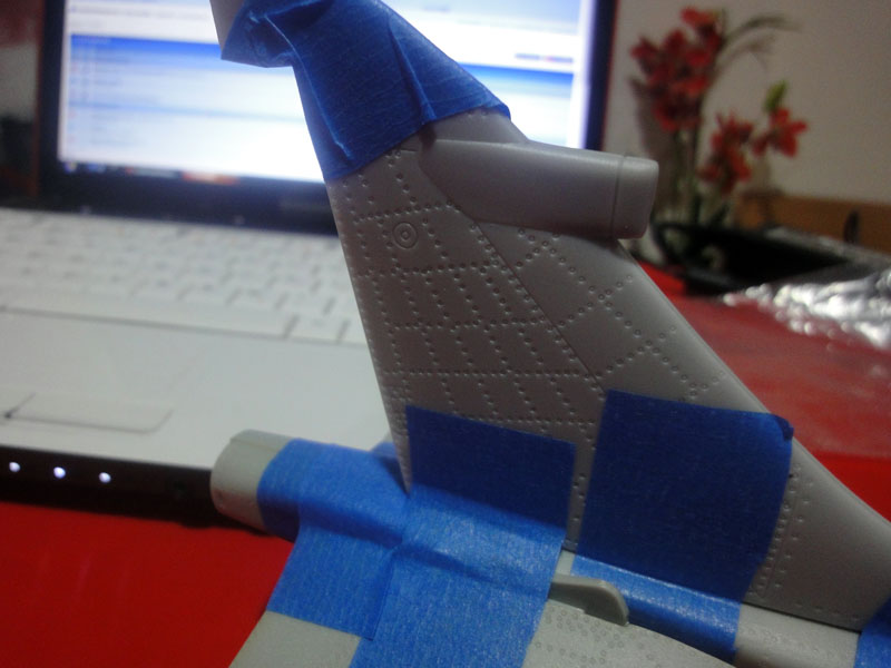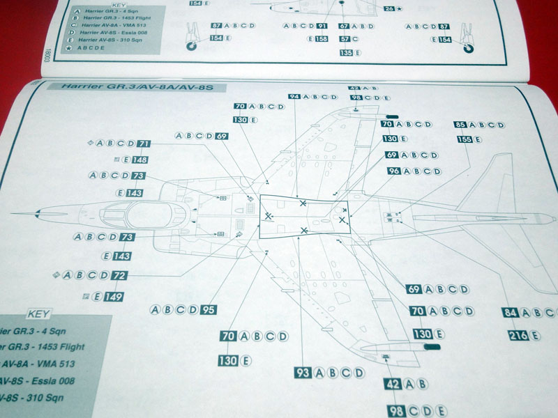 Construction breakdown is rather tricky due to the ill fitting parts especially on the air intakes and fuselage halves. There is a lot of cleanup required. The most obvious and troublesome flaw in the kit the the hundreds on rivet/fasteners on the fuselage. The GR3 has most of the fuselage in a smooth finish except for some panels in reality. A lot of putty and sanding work will be required. The clear parts are a bit thick and will require some cleaning and polishing. The decals are impressive in size but not in quality as they are badly out of register, especially for the stencil markings involving colours over a white undercoat. That said, 5 different markings are provided, a NATO Harrier ( based in Germany ), a Falkland campaign warbird, an American AV8A, a Spanish and a Thai Airforce plane. All good choices, showing the different paint schemes.