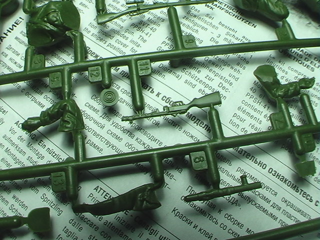 The facial sculpt is adequate and should do nicely with detailed painting while the Mosin sniper rifles , SVT-40 and PPSH-41 is provided in the set. Though not as detailed as Dragon's Gen2 set, it is still adequate and can quickly be assembled with some minor putty works in the joins. The figures are divided in the usual head, torso, hands and 2 lower body sections