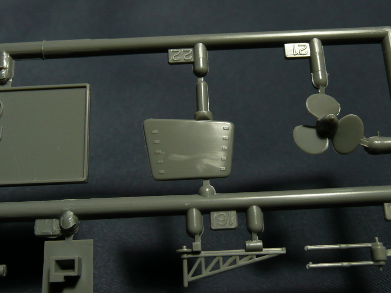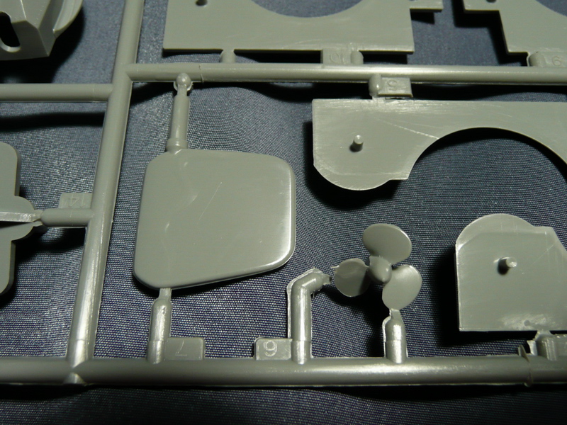 The main hull is provided in one piece. There is a seam that runs from fore to aft of the hull and this needs to be taken care of. Moulded on step ladders are provided at the rear of the hull as well as port holes at the fore and aft. A little bit of blemish can be seen around the porholes of my copy.